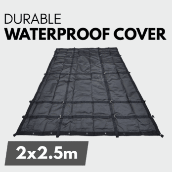 2.5m x 2.0m covers single, double, and open trays with room to spare.